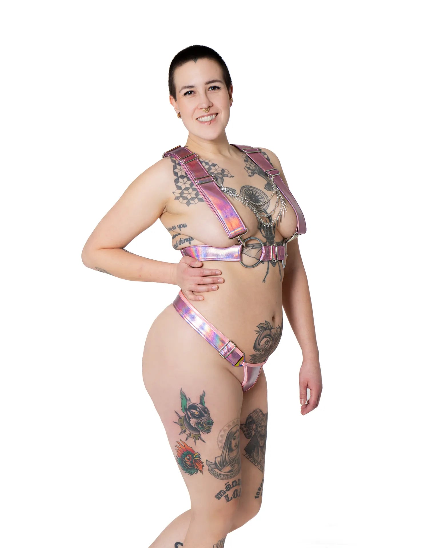 Der Star unserer Kollektion 2024/25. Ein auffälliger und farbenfroher Harness für alle. Extra breite Riemen aus veganem Leder und große Elemente aus hochwertigen Metallen kombiniert mit verspielten Details sind das Herzstück dieses neuen und einzigartigen Looks.